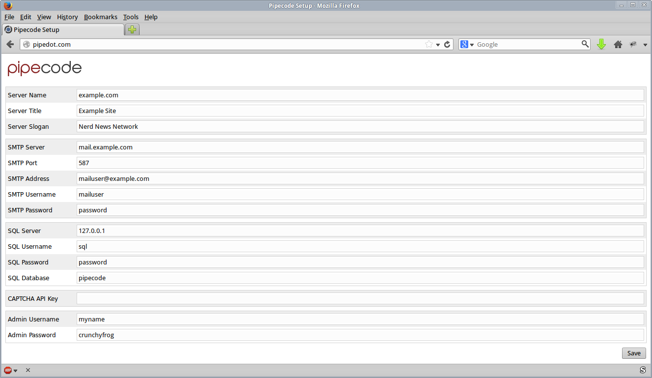 ConfigureNow that you've installed Pipecode, fire up a browser and point it to the address of your new webserver. The installation wizard should be visible. If not, then you foobar'ed something and need to go back. SMTPPipecode sends users email for registration, notifications, and other stuff. Therefore, you need a valid mail server account. The default SMTP port is 25, but port 587 is becoming popular for submission. Pipecode will use SMTP AUTH with TLS encryption. If your server doesn't support this, well, it should. Fix it. SQLFill in the required information, such as "SQL Server", "SQL Username", "SQL Password", and "SQL Database" CAPTCHAYou should get a textcaptcha.com API key so that you can download new CAPTCHA strings. If you don't want to use their free service, you can generate your own and leave this field blank. Admin AccountEnter a username and password for the admin user account. You will do all further configuration to the system by logging into this account. FinishOnce you are satisfied, click the "Save" button at the bottom to generate your config file. If all goes well, you should be up and running with a new Pipecode installation! |